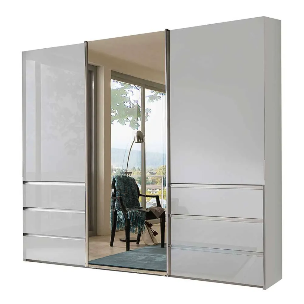 - Oberfläche der Front mit weißem Glas beschichtet, Korpus foliert, Innendekor in Silber-Grau gestreift