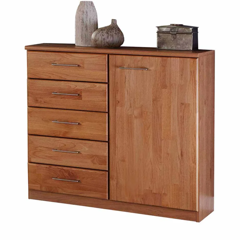 - Holzwerkstoff Oberflächen (Korpus, Sockel und Abdeckplatte) im Holzdekor Erle foliert, Massivholz (Front) lackiert