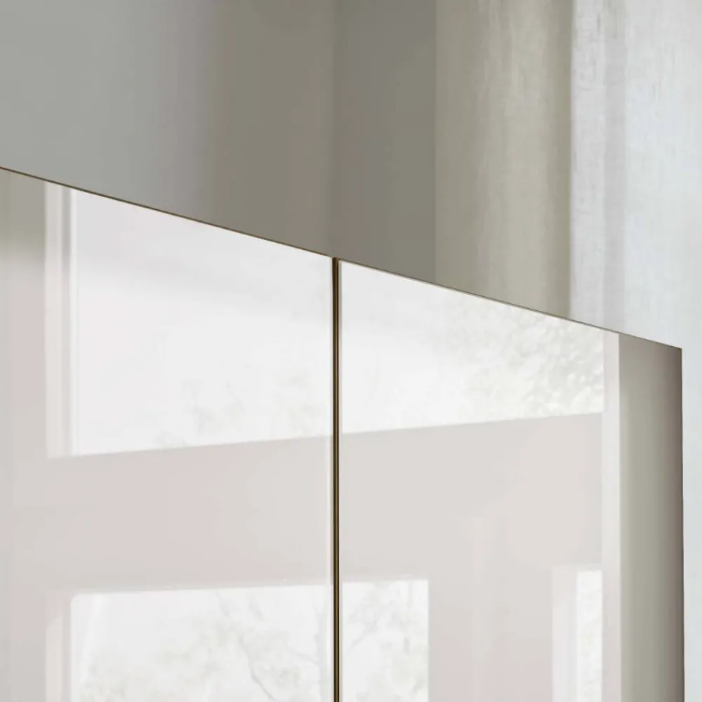 - Fünf Türen aus Holzwerkstoff mit weißer Glasbeschichtung, Bauchbinde Massivholz, Soft Close Metallscharniere