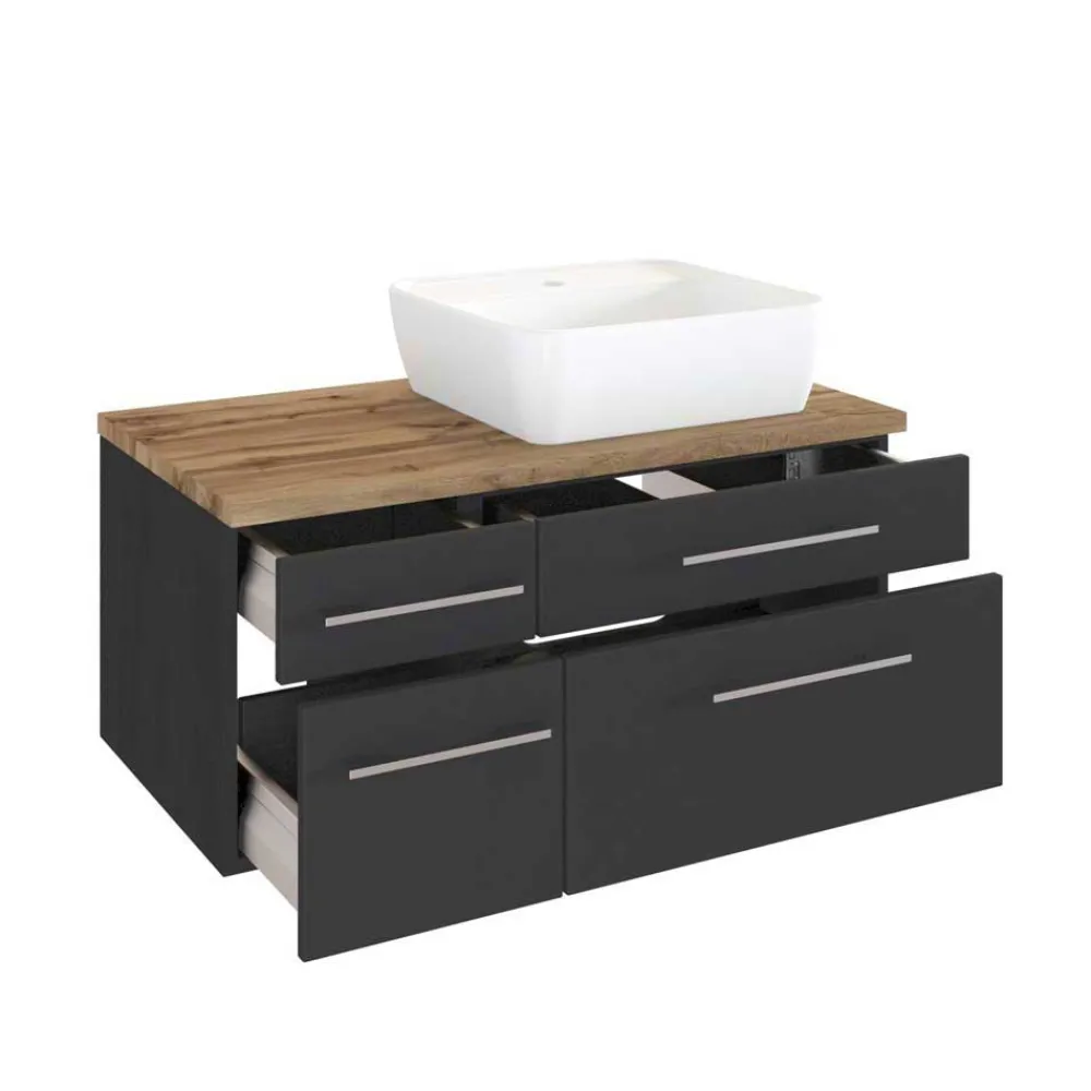 - Korpus in dunkel Grau melaminbeschichtet, Front in dunkel Grau und Deckplatte im Holzdekor Wildeiche foliert