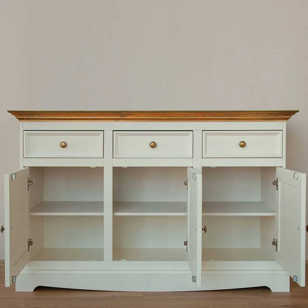 - Liebevolle Details wie eine formschön gefräste Deckplatte, Schubladen in Kassettenoptik und Türen mit Rillenstruktur unterstreichen die Hochwertigkeit
