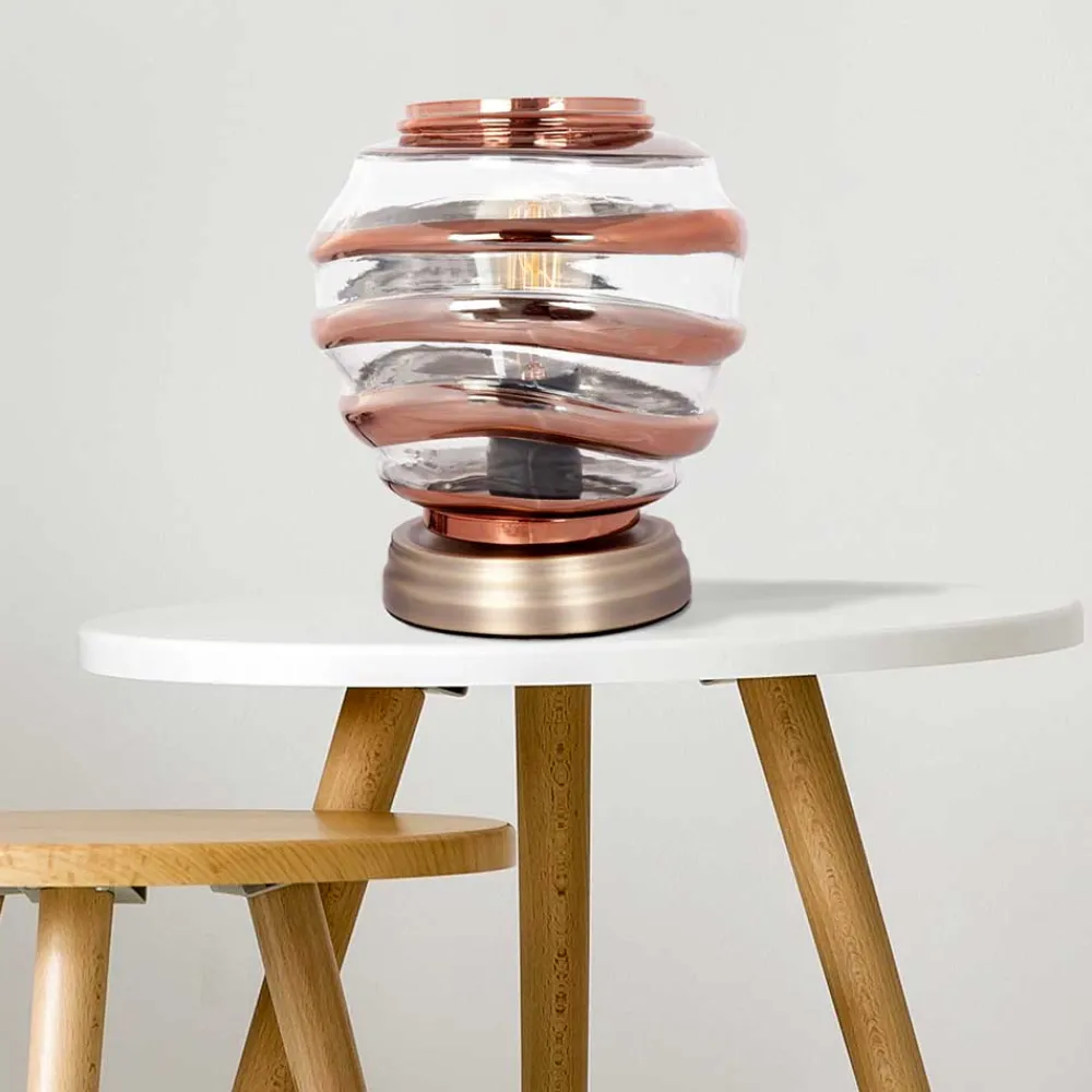 - Designstarke Tischleuchte in Kupfer- und transparent Champagnerfarben