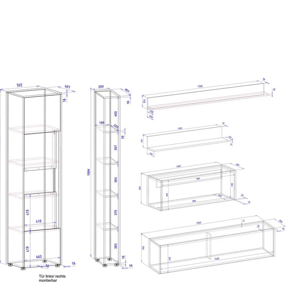 - Wandmontage sowie flache Kunststoffgleiter, eine zusätzliche Kippsicherung der hohen Möbel ist erforderlich