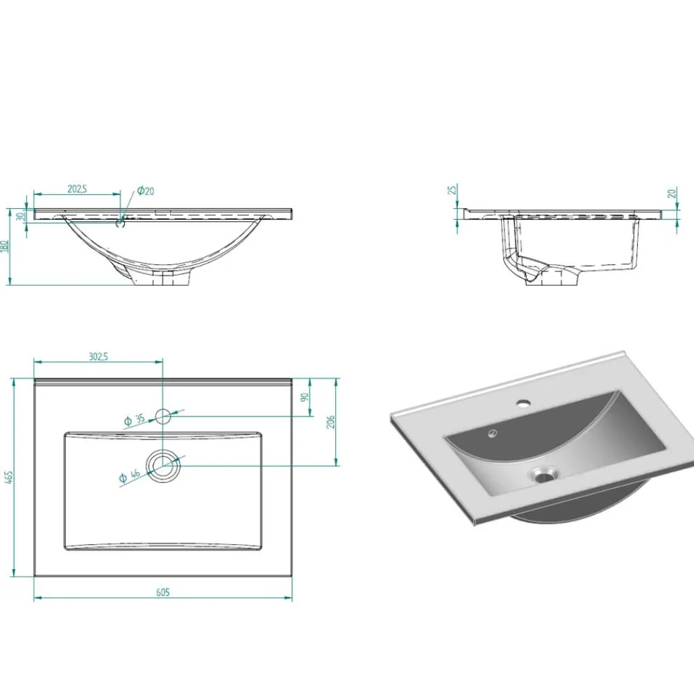- Innenmaße des Waschbeckens BxHxT: 46x13x27 cm