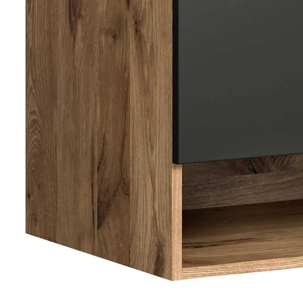 - Front melaminbeschichtet in Dunkelgrau matt und Wildeiche Holzoptik, Kanten tiefgezogen, Korpus in Holzoptik foliert