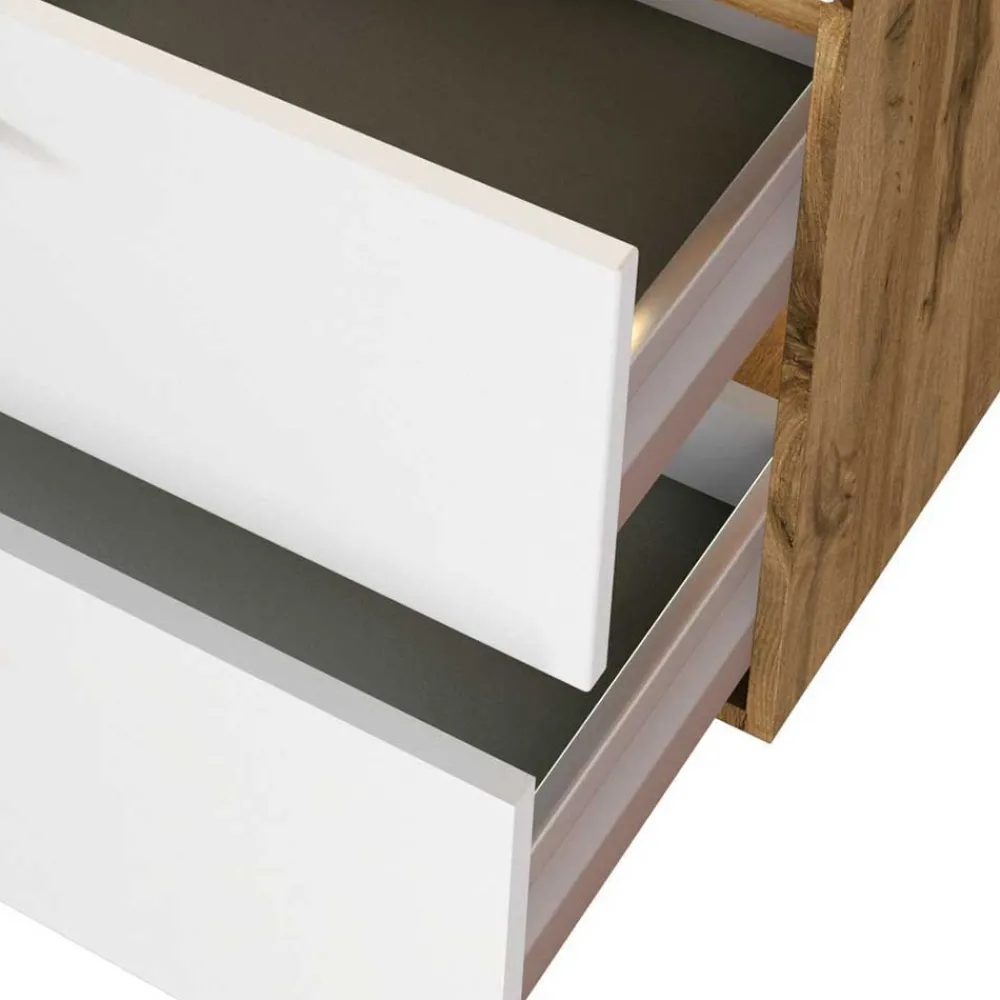 - Korpus melaminbeschichtet in Holzoptik Wildeiche, Front des Waschtisches foliert in matt Weiß