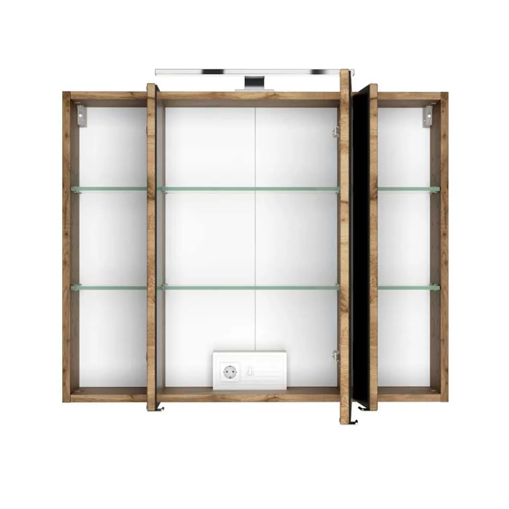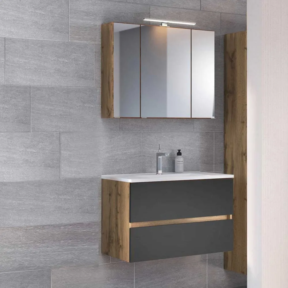 - Korpus sorgfältig melaminbeschichtet in Holzoptik Wildeiche, Waschtischfront foliert in Dunkelgrau matt