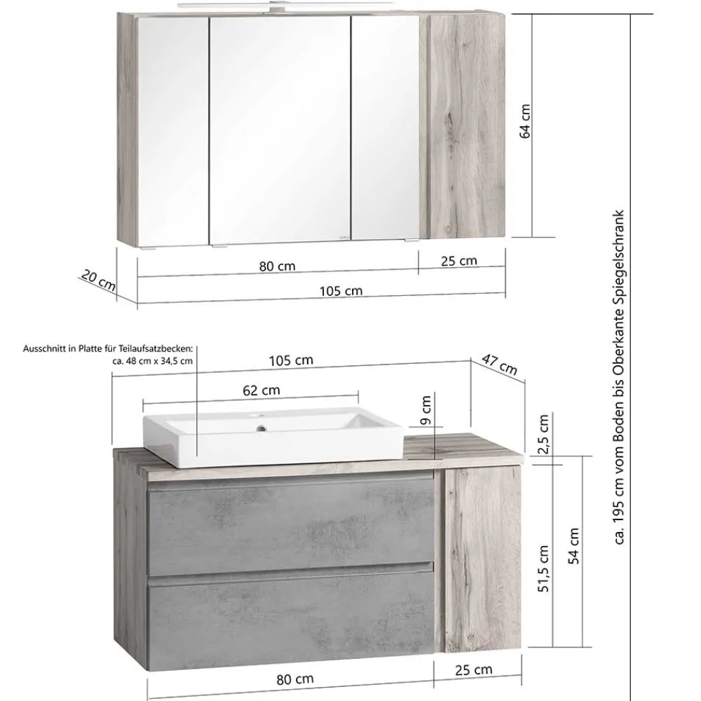 - Korpus und seitliche Türen in Holzoptik Wildeiche melaminbeschichtet, Schubladenfronten tiefgezogen dunkelgrau matt foliert
