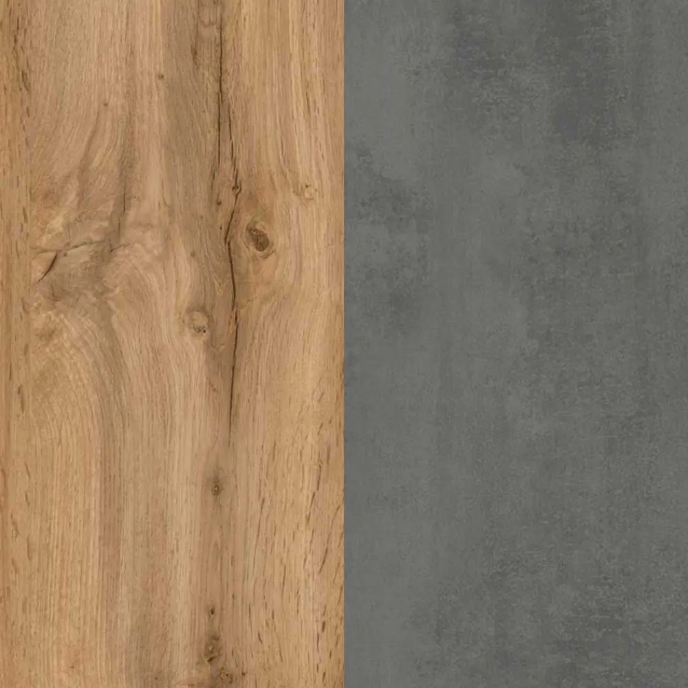 - Korpus und seitliche Türen in Holzoptik Wildeiche melaminbeschichtet, Schubladenfronten tiefgezogen betongrau foliert