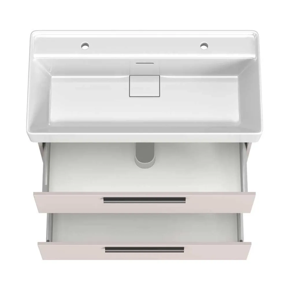 - Zwei Schubladen mit Metallauszug und Soft-Close Funktion, in der oberen ein Siphonausschnitt