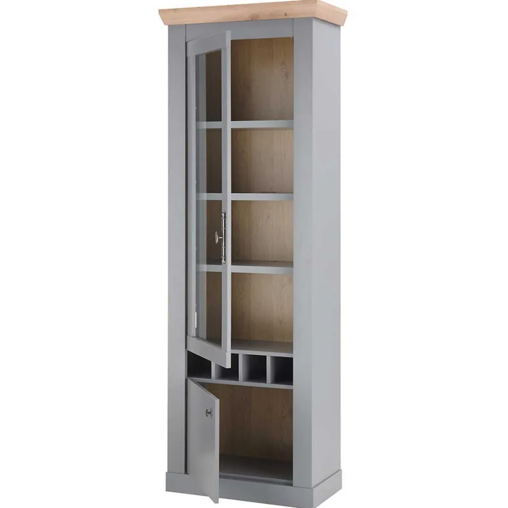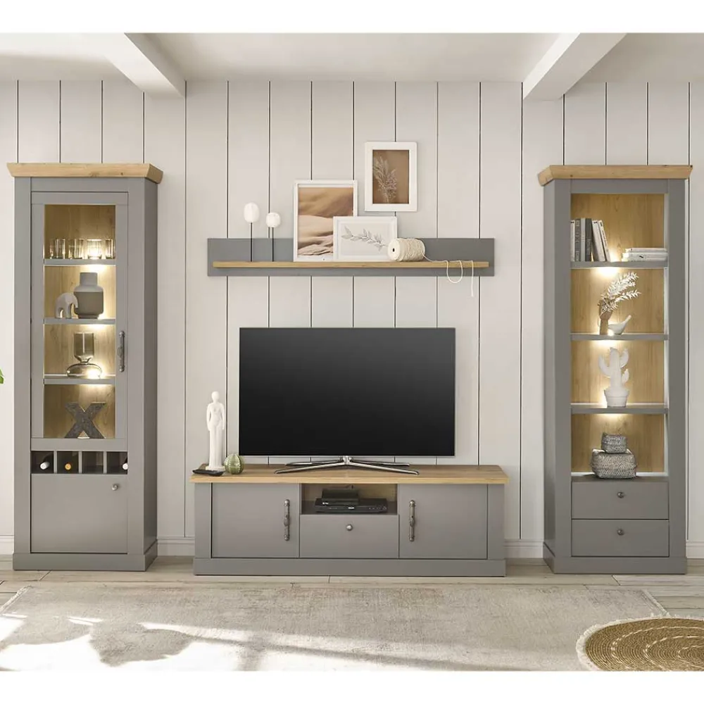 - Schicke Wohnwand in Lichtgrau und Eichefarben