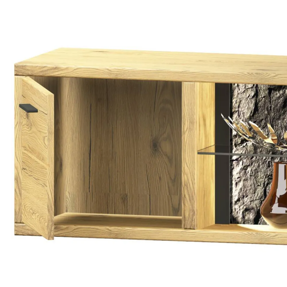 - Offenes Fach mit einem Glasboden, Rückwand Rioja-Felsenoptik in Grau-Braun, MDF Rahmen schwarzgrau lackiert