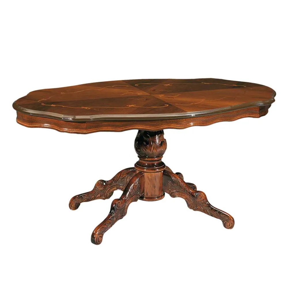 - Platte aus MDF, furniert mit Nussbaumholz, mit dekorativen Intarsien aus Pappelholz, an den Kanten aufwändig geschwungen und profiliert, lackiert