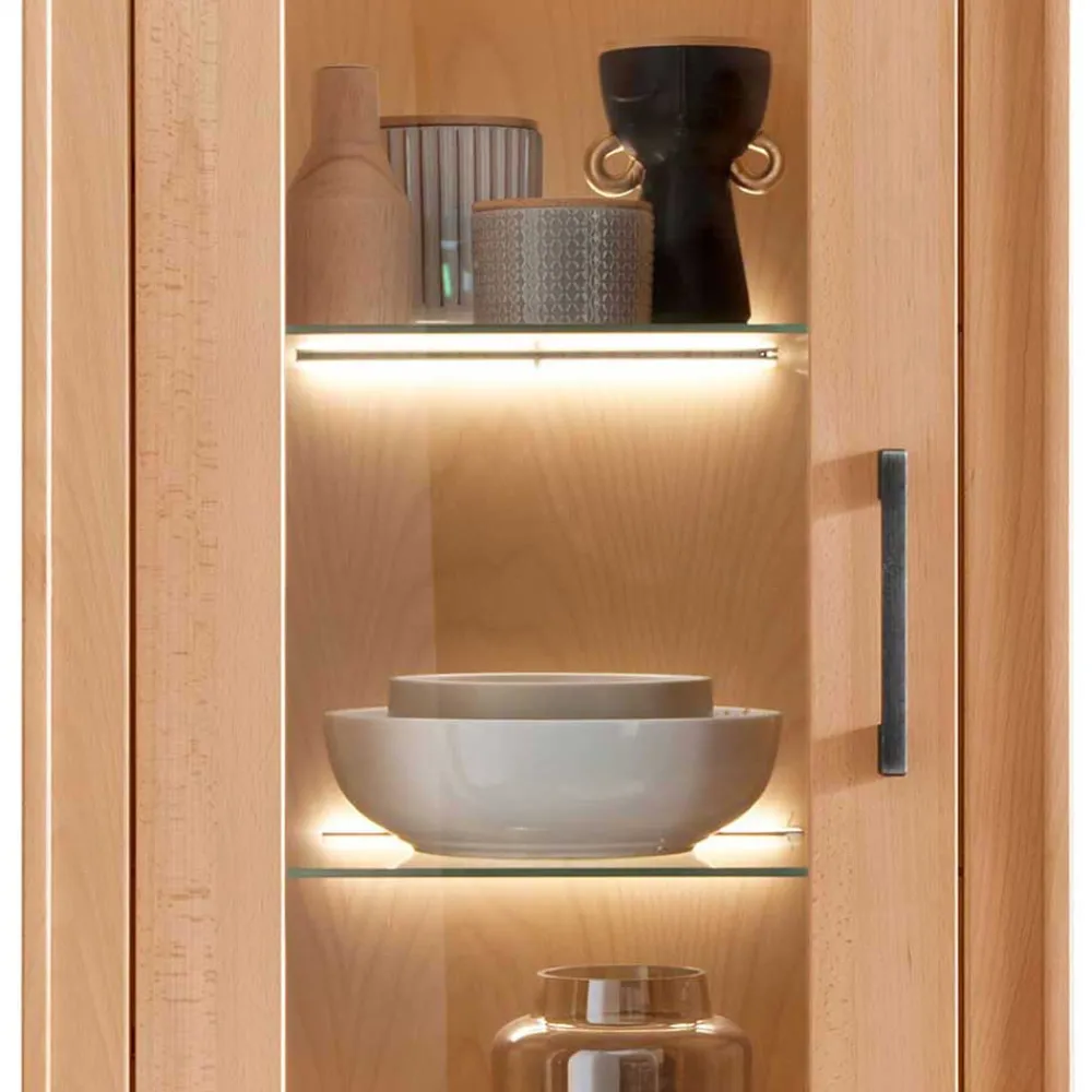 - In der Variante mit variabler LED-Beleuchtung von Glasboden oder Rückwand lieferbar (Vitrine/Highboard)