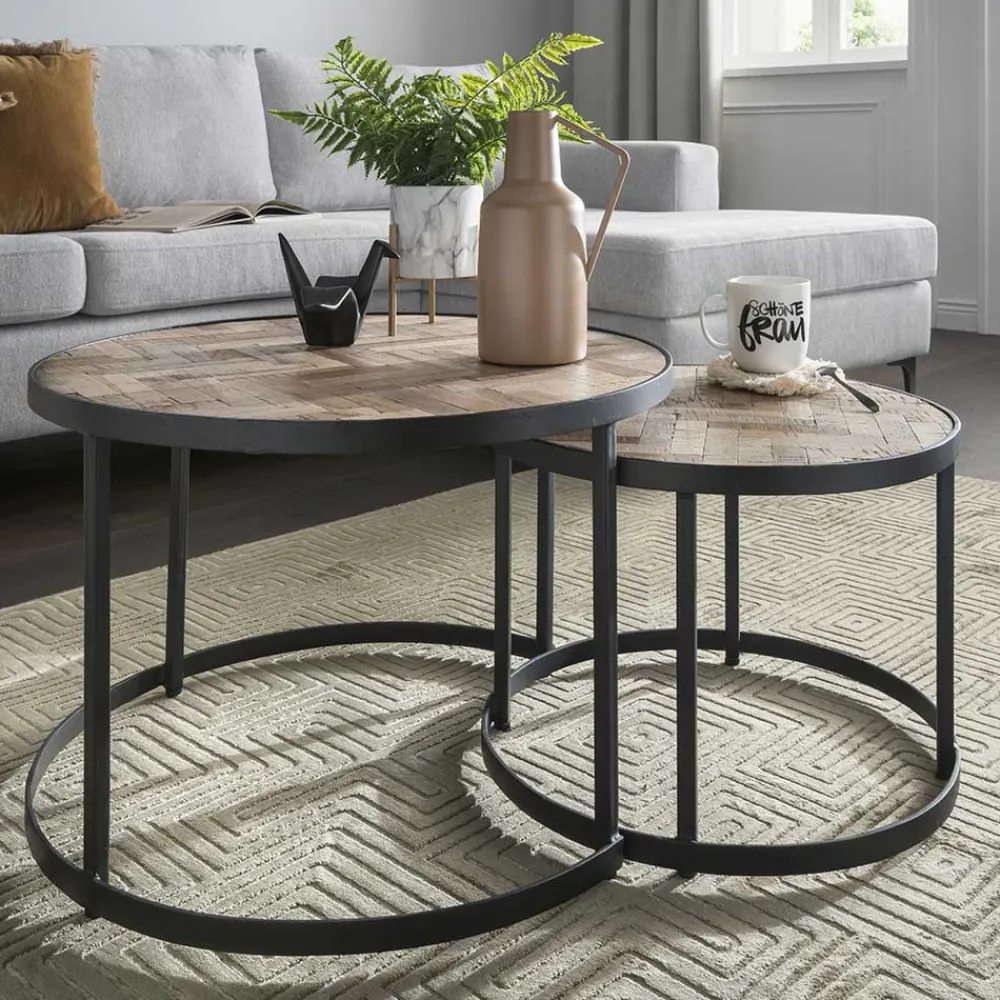 - Exklusive Zweisatz Tische in Teak Grey Wash und Schwarz