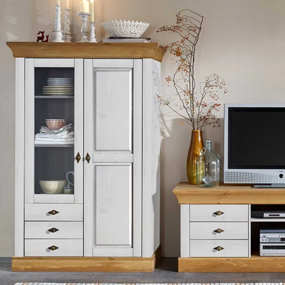 - Hochwertiger Vitrinenschrank in Weiß und Kiefer laugenfarbig